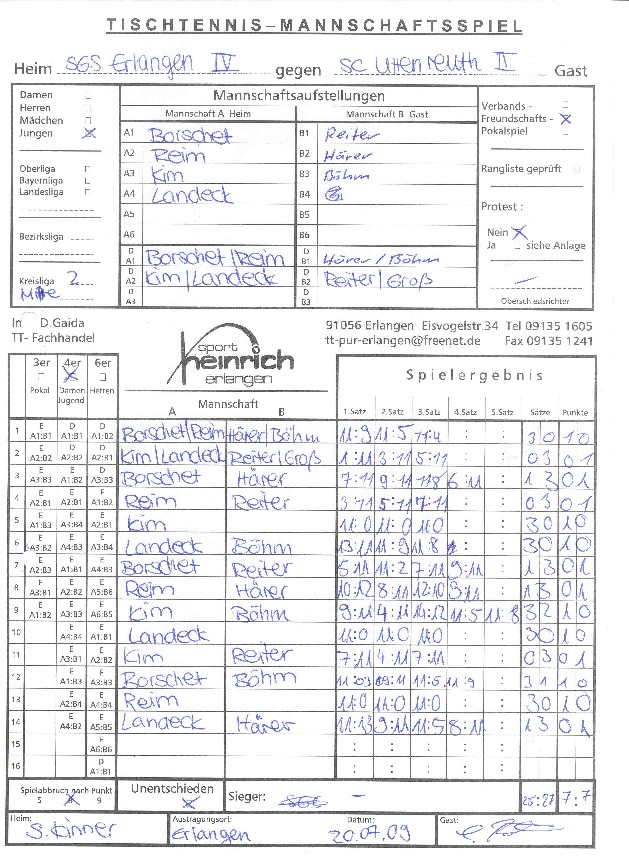 Endlich konnte SGS II einmal in der derzeit bestmöglichen Aufstellung antreten. Das machte sich in den Einzelerfolgen im 2. und 3. Paarkreuz bemerkbar, wo kein Einzel abgegeben wurde. Im vorderen Paarkreuz spielte Andres stark auf und gewann beide Einzel; dazu kam noch das Doppel Andres / Florian (trotz der "Höchstrafe" von 0:11 im ersten Satz).